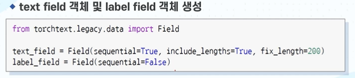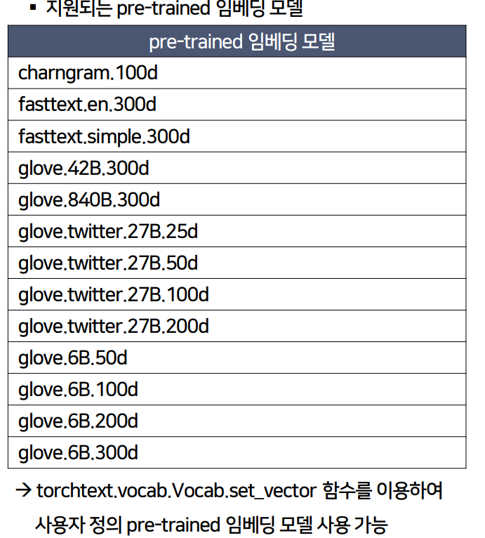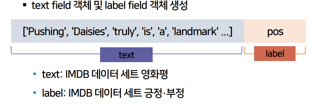 - torchtext 라이브러리는 파이토치 환경에서 자연어 처리의 전처리, 데이터 분리 등 편리한 기능 제공