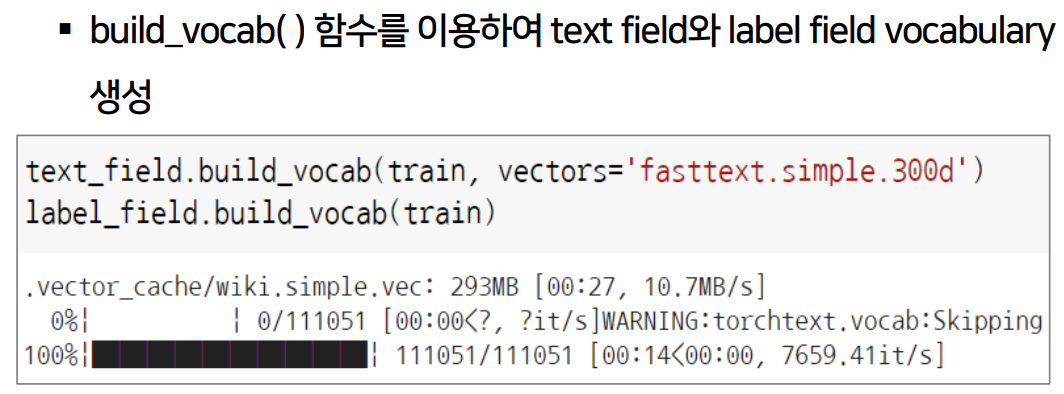 - label_field_build_vocab에는 긍,부정만 들어있기에 사전 학습 필요가 없음.