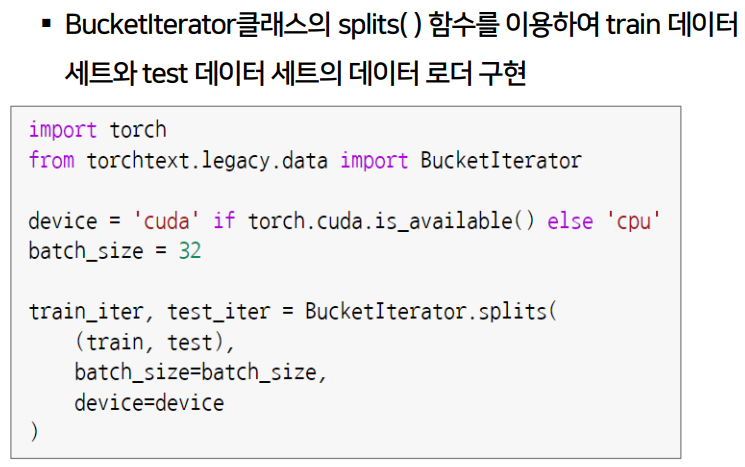 - 데이터 로더 중 우린 BucketIterator를 사용함.