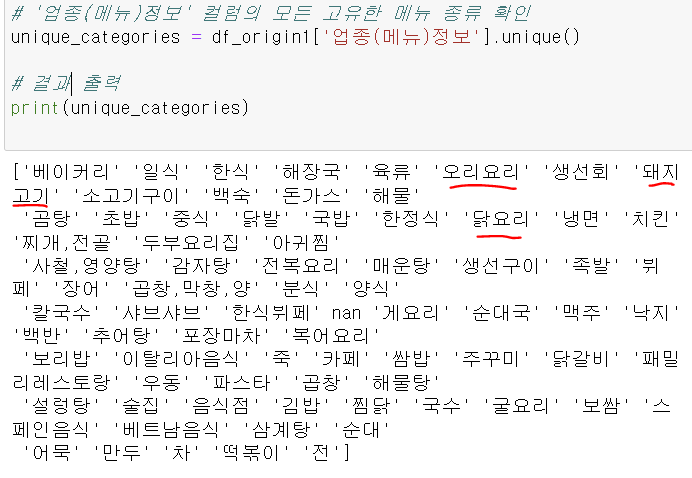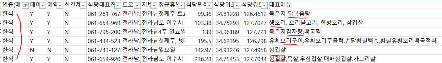 3) 업종(메뉴)정보의 '한식' 전처리 과정