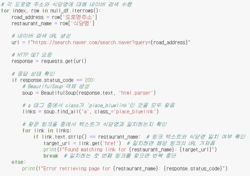 - 계획 : 네이버 검색에서 '도로명 주소' 검색 후에, 그 도로명에 '식당명' 동일한 식당명이 있다면?