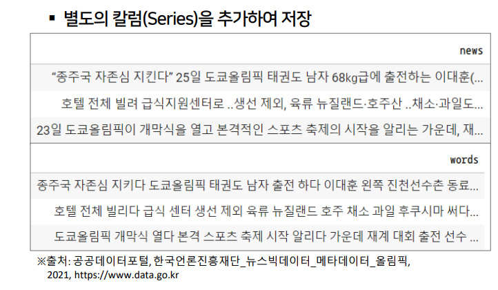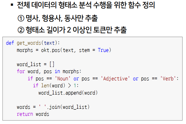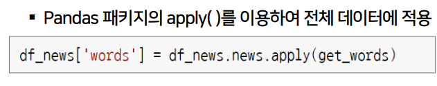 - get_words 실행되어 나옴 return 값을 df_news에 새로운 컬럼 'words' 생성